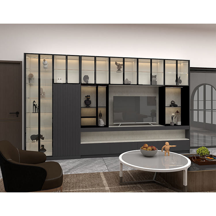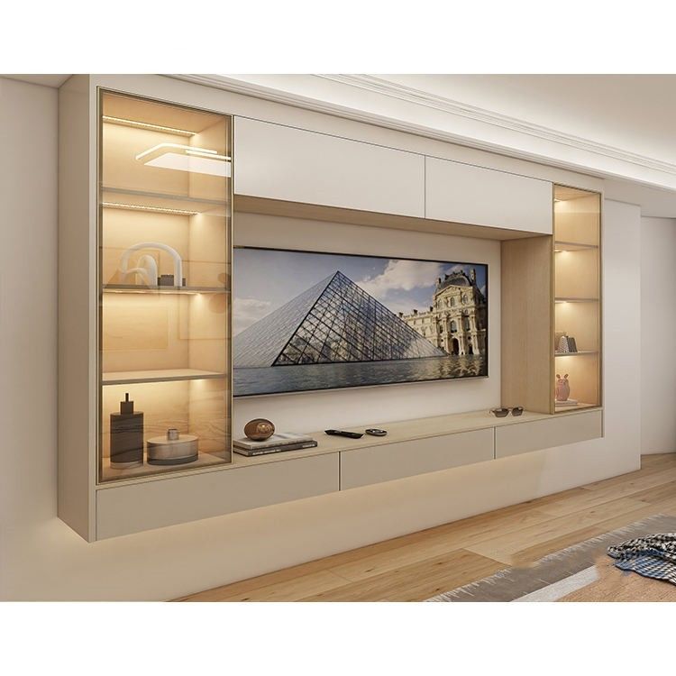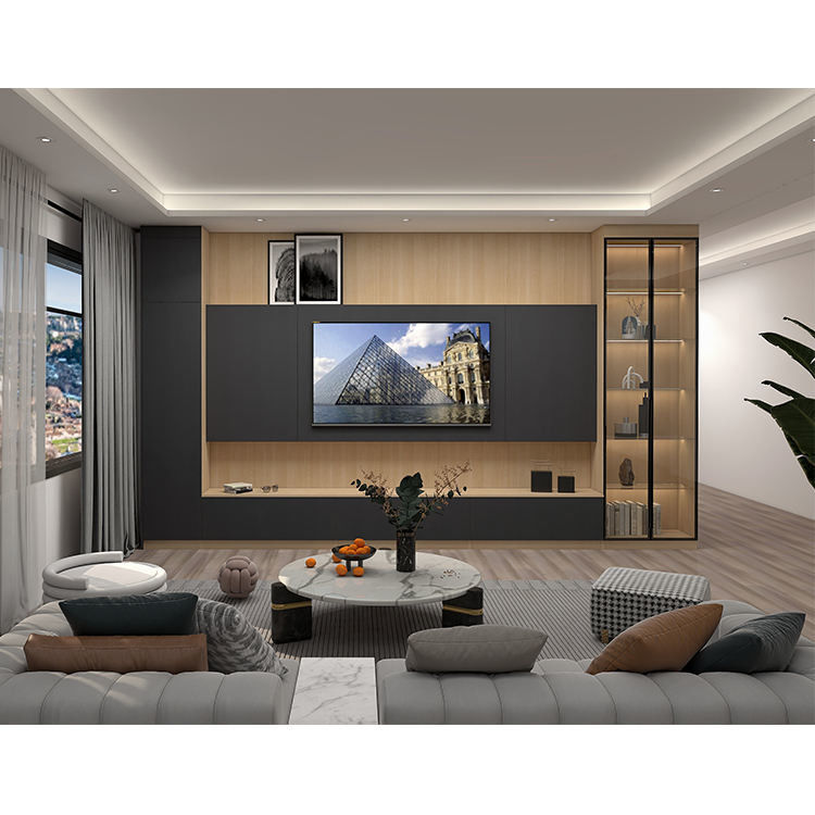 Estructura principal: La estructura principal de un gabinete colgante de la pantalla TV se compone generalmente de los tableros de alta calidad, tales como madera contrachapada o panel de fibras de madera medio de la densidad (MDF). Estos tableros tienen altas estabilidad y durabilidad, y pueden soportar el peso de televisiones y la presión traída por uso a largo plazo.
