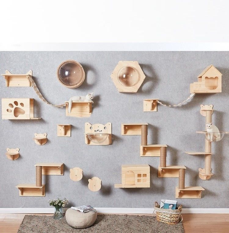 Tablero del polo que sube o de la garra: Las combinaciones montadas en la pared del marco que sube del gato se pueden equipar del tablero del polo que sube o de la garra para proporcionar más oportunidades del entretenimiento y del ejercicio para los gatos. Los polos y los tableros del rasguño que suben se hacen generalmente del material de madera, añadiendo a la diversión y a la actividad del gato.