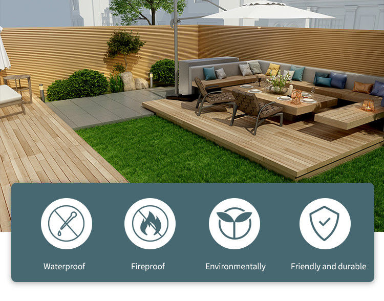 Material de WPC: Los paneles de revestimiento de madera al aire libre de la parrilla de WPC se hacen del compuesto del madera-plástico (WPC), una mezcla de fibra de madera y el polietileno o la resina de alta calidad del polipropileno. Los materiales de WPC combinan la textura natural y la textura de la madera con el agua y la resistencia a las inclemencias del tiempo del plástico, haciéndolas ideales para la decoración al aire libre.